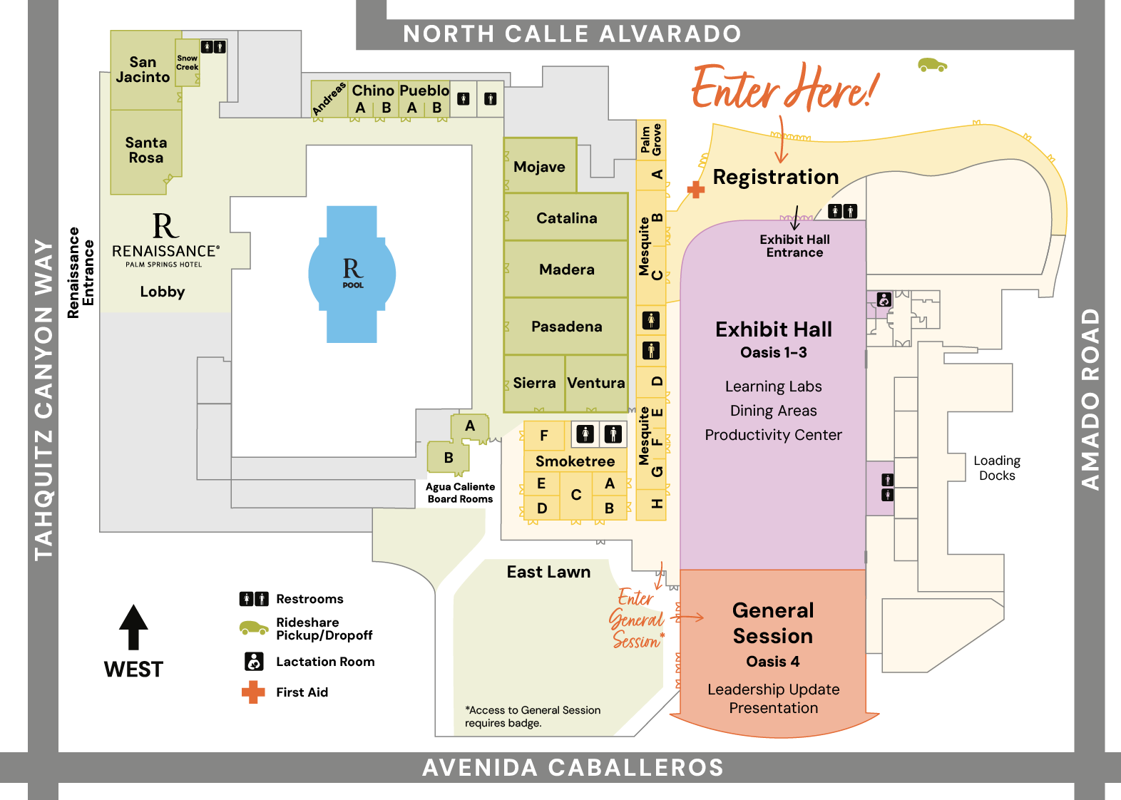 Looking for details regarding a location, amenity, or service provided at the conference? Look no further! This page contains everything you need to know to be ready for your next few days here with us in Palm Springs.